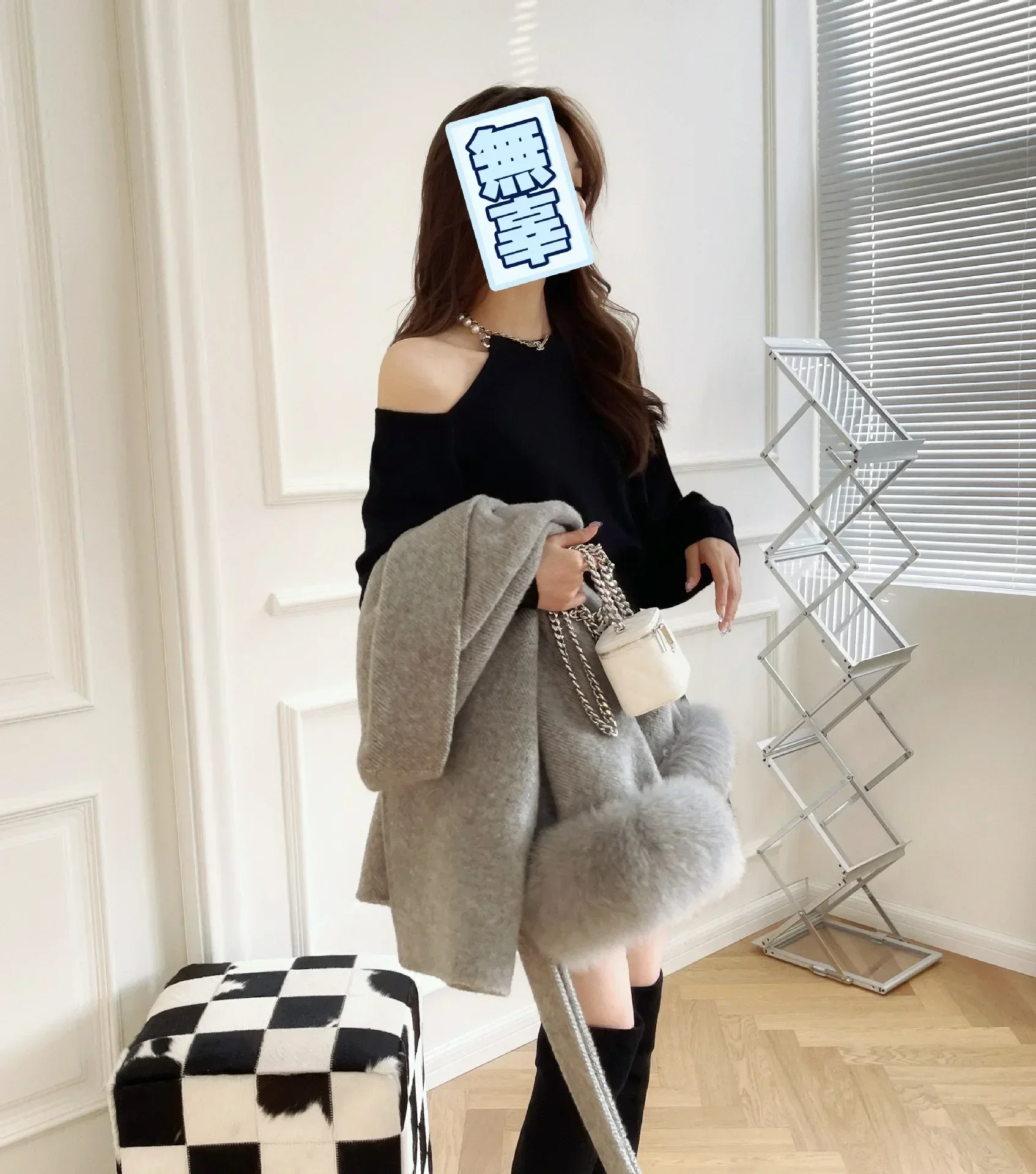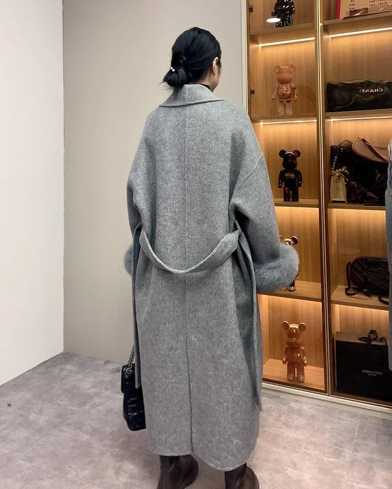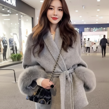 Luxurious women's short jacket with 100% wool cashmere & real fox fur. Features double-sided wool strapping, removable cuffs, and a high-end design. Shop this elegant fur coat now.