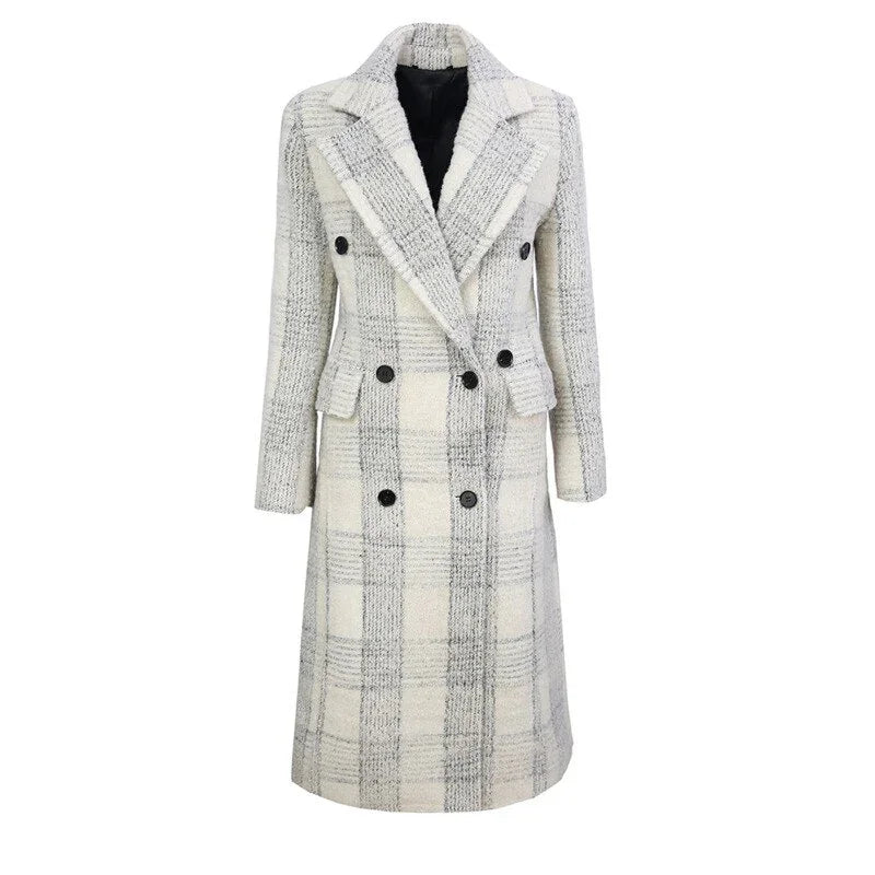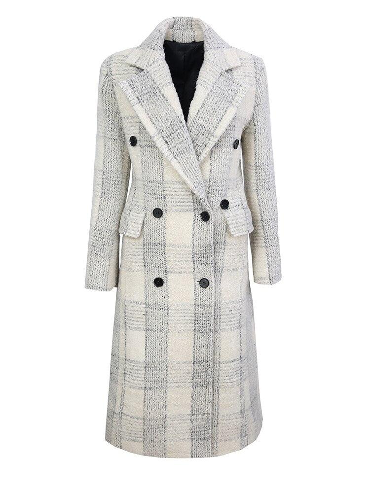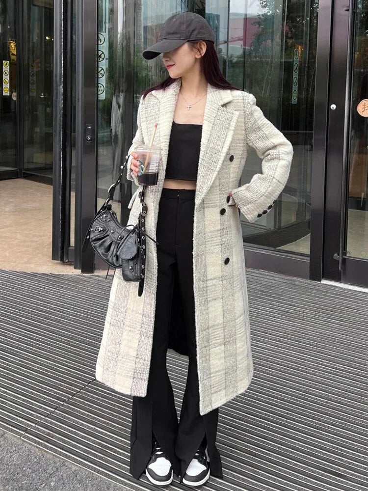 Discover this elegant long wool coat for women. Featuring a stylish loose fit and classic white plaid pattern, this warm parka is the perfect trendy outerwear piece for the autumn and winter seasons. Gently wash to maintain its quality.