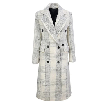 Women's Loose Fit White Plaid Wool Coat - Long Elegant Parka for Autumn & Winter