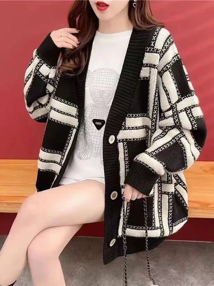 Embrace effortless style this autumn with our Temperament V-Neck Plaid Cardigan. This casual, loose-fitting knitted coat is designed for comfort and sophistication. It features a unique contrast color patchwork design and a flattering V-neck, making it a versatile layering piece for your wardrobe.
