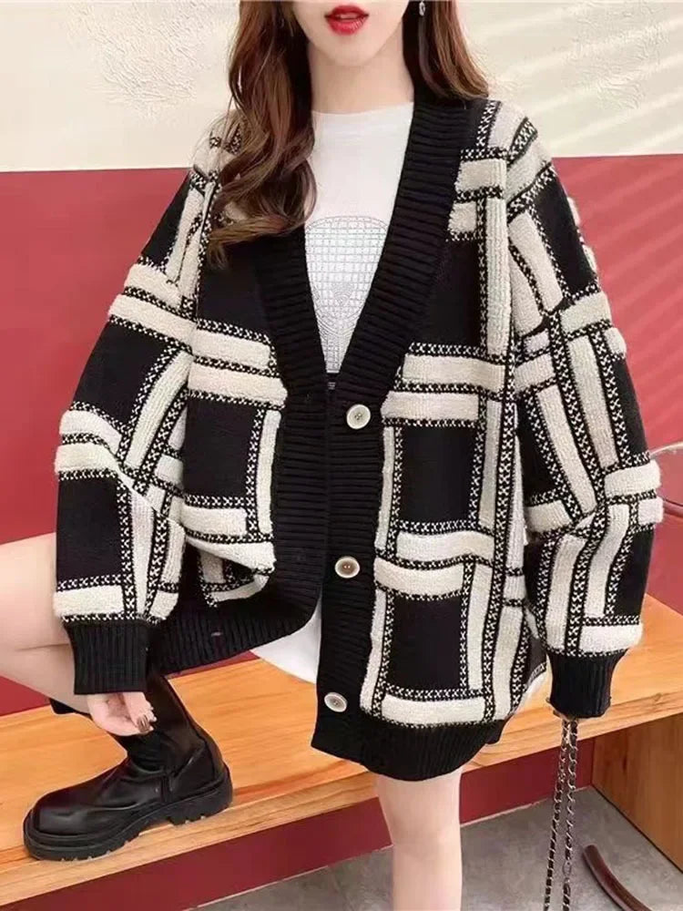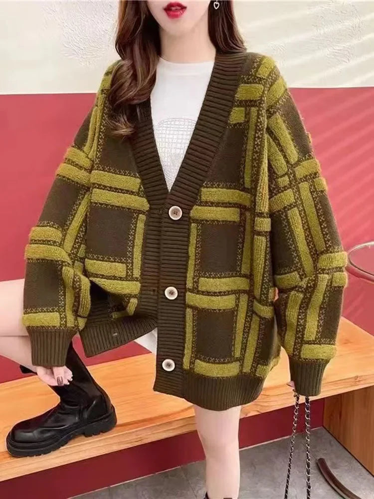 Women's Plaid V-Neck Cardigan | Contrast Patchwork Loose Knit Coat | Autumn Casual Sweater